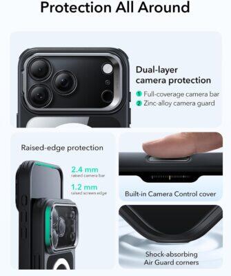 جراب ESR HaloLock الكلاسيكي الهجين لهاتف iPhone 17 Pro Max مع حامل مخفي (زر التحكم في الكاميرا) – شفاف