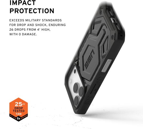 Military Grade Drop Tested: PC + TPU Chassis (TPU frame, PC backplate). Sculpted corners for reinforced drop protection and hex pattern for increased shock absorption. 25 ft. Drop Protection (7.6 meters). Meets 5X Military drop-test standards (MIL STD 810G 516.6).